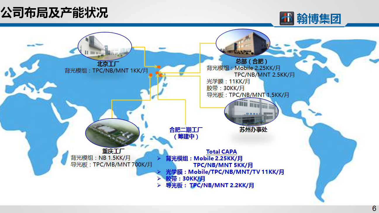 翰博集團始創(chuàng )于2005年9月,是國內光電顯示行業(yè)第一家集顯示設計、光學(xué)開(kāi)發(fā)、智能制造、供應鏈整合于一身的系統方案供應商,是國內最大的液晶顯示面板企業(yè)京東方在顯示類(lèi)材料中的戰略合作伙伴,其業(yè)務(wù)范圍覆蓋北京、合肥、蘇州、香港、重慶等地。集團研發(fā)設計的背光模組、偏光片等產(chǎn)品,廣泛應用于數字電視、液晶顯示器、筆記本電腦、平板電腦、智能手機、車(chē)載顯示等液晶顯示產(chǎn)品。集團自從2014年起進(jìn)入快速發(fā)展期,實(shí)現了逐年跨越式發(fā)展,當前集團公司擁有員工總數6000余人。201511月份,翰博集團正式在新三板掛牌上市。成為國內光電顯示行業(yè)第一家以背光模組為主營(yíng)業(yè)務(wù)的新三板掛牌企業(yè)。